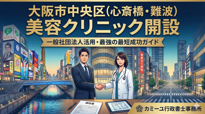大阪市中央区(特に心斎橋・難波エリア)で美容クリニックを早期開設するには、医療法人設立を待たずに「一般社団法人」を活用するスキームが最適です。大阪市保健所中央分室の審査は市内でも特に厳格であり、構造設備基準と非営利性の疎明が鍵となります... -