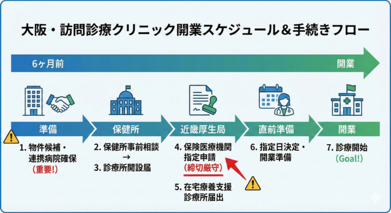 訪問診療の開業では、内装や設備よりも「届出とスケジュール設計」が最も重要になります。本記事では大阪府における訪問診療クリニック開業の流れを、医師向けに体系的に解説します。