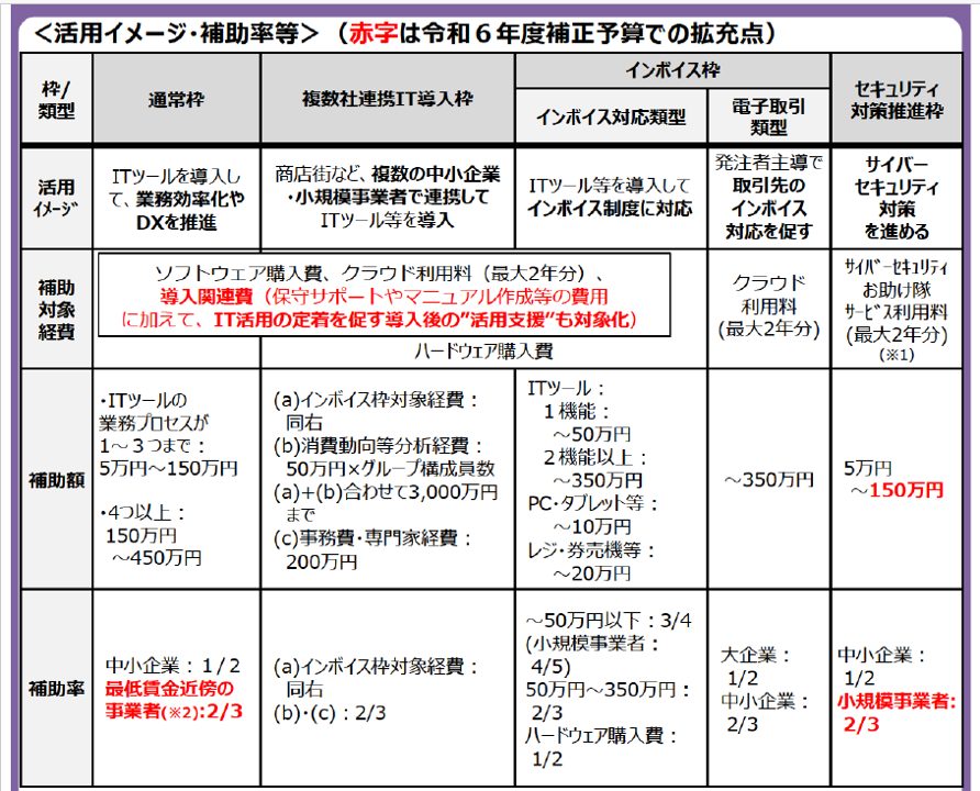 また、セキュリティ対策推進枠の補助率や補助額も拡充されるほか、導入後の「活用支援」が新たに補助対象になり、ITツール活用の定着を促す支援が強化される見込みです。